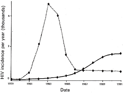 ![]() HIV transmission mode 1971-1991. Solid line heteroseχual transmission