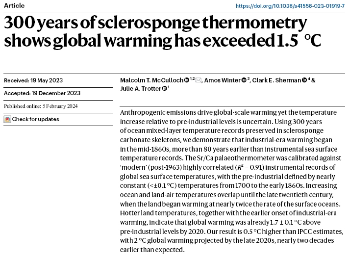 ![]() McCulloch, M. T., et al (2024) 300 years of sclerosponge thermometry shows global warming has exceeded 1.5°C. Nature Climate Change, vol 14, p171-7. © Nature Climate Change used here in the context of a non-commercial review. |