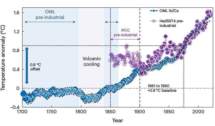 Spring 2024 Sponges reveal that the Earth has possibly already warmed by over 1.5°C! You may recall that the 2015 COP's Paris Accord had the goal of keeping global warming to below 1.5°C above the pre-industrial temperature. However, have you ever considered what the 'pre-industrial' temperature was? Ship-based instrumental measurements of sea surface temperature only began in the 1850s and with land-based instrumental measurements also from that time. This means that the Intergovernmental Panel on Climate Change (IPCC) uses the global temperature from the 1850s as being representative of the pre-industrial temperature and even here there are issues as measurement back then was not as comprehensive as today with more sites at which measurements are made. |