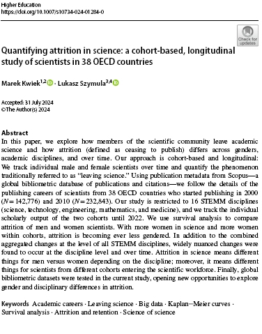 ![]() Kwiek, M. & Szymula, L. (2024) Quantifying attrition in science: a cohort-based, longitudinal study of scientists in 38 OECD countries. Higher Education. DOI.org/10.1007/s10734-024-01284-0.