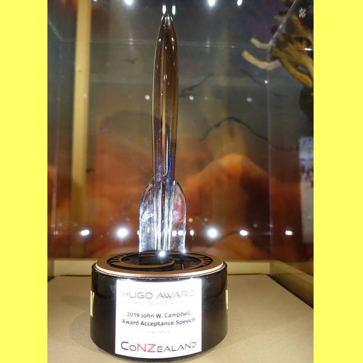 ![]() This is one of the Hugo Awards for 'SF achievement' (designed by Pete Weston) technically presented at the 2020 SF Worldcon in New Zealand. Alas, though I was due to go, none of us did due to CoVID lockdown. This Hugo Award in the 'Best Related World' category went to Jeanette Ng for her acceptance speech at the previous year's Worldcon for the John W. Campbell Award for Best New Writer. Jeanette outed editor John W. Campbell for his racist beliefs. As a result, the John W. Campbell Award was subsequently re-named the Astounding Award after Astounding magazine. Jeanette loaned this to the exhibit. |