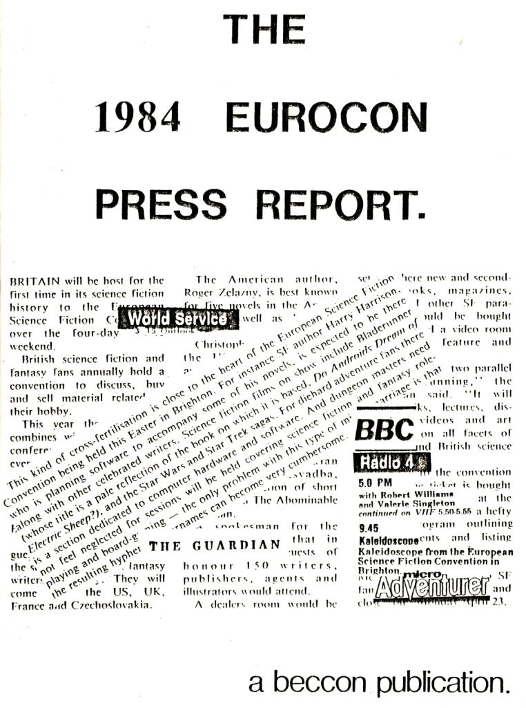 Because the press operation was so (ahem) successful, I was encouraged to do a write-up for convention organisers which appeared as a small booklet, The 1984 Eurocon Press Report. (See left for cover.) With the coming of the internet, blogs, social media etc, much of this guidance is now very dated. However, a one-size-fits-all press release still needs to be avoided and personal cultivation of individual press contacts' relations encouraged.