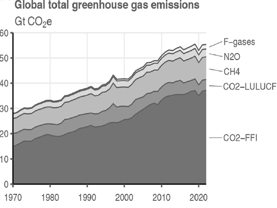 ![]() Global greenhouse gas emissions. F = flurochloro gases. LULUCF = land use, land-use change and forestry. FFI= Fossil Fuel Industry. From Foster, P. M., Smith, C., Walsh, T., et al (2024) Indicators of Global Climate Change 2023: annual update of key indicators of the state of the climate system and human influence. Earth System Science Data, vol. 16, p2,625–2,658. Used under non-commercial fair use and also Creative Commons Attribution 4.0 License. |