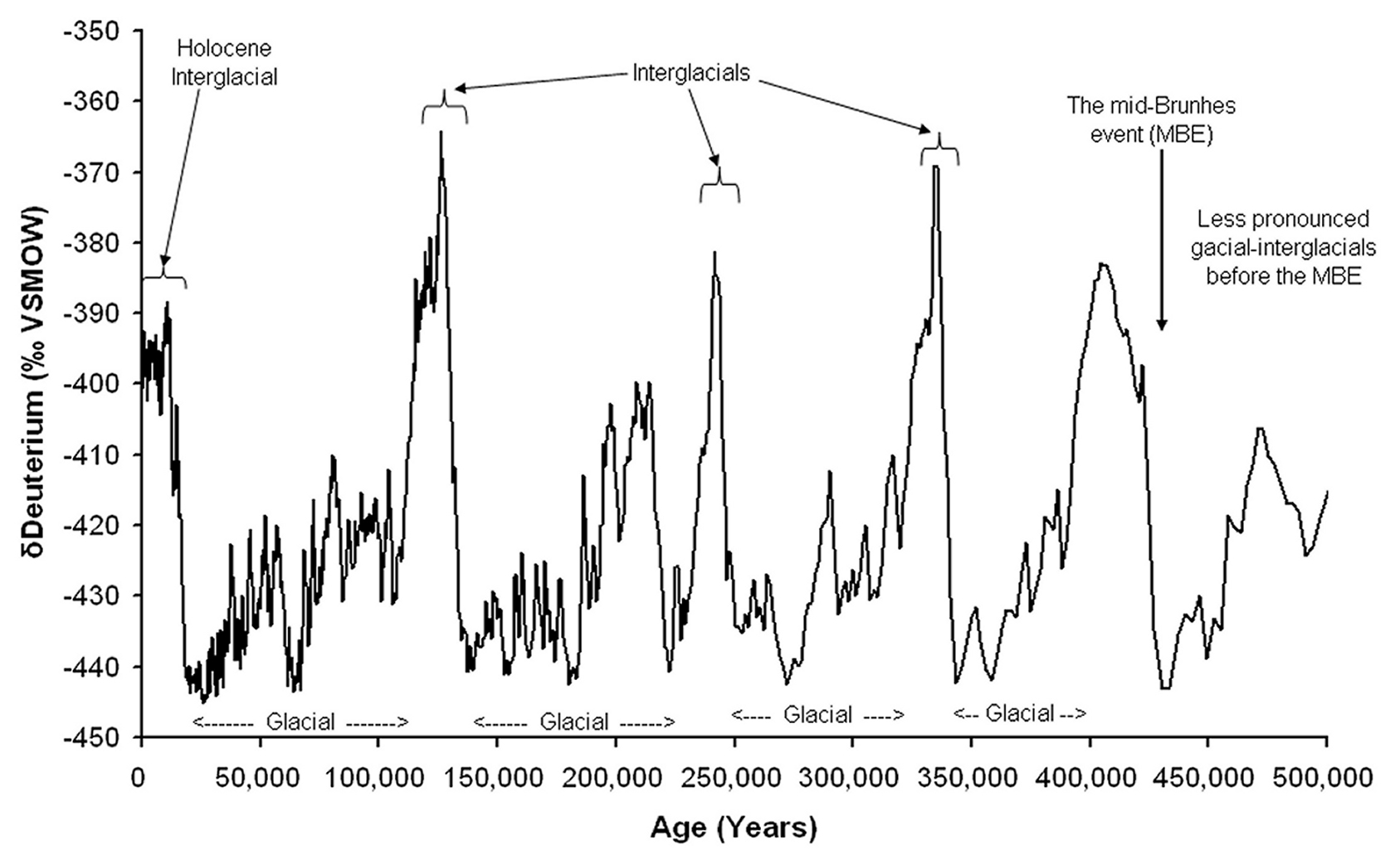 ![]() Antarctic region temperature (as reflected by deuterium water ice concentration) for the past half-million years. (Heavier than hydrogen, deuterium takes more energy [heat] to evaporate from the ocean before falling as snow becoming ice.) This graph is actually based on another Antarctic ice-core data set (which I used for some work of my own) but I have adapted it showing when the MBE transition ocurred. Deuterium concentration is a palaeotemperature-indicator/proxy of (simplistically speaking, near hemispheric) regional temperature. The Vienna standard mean ocean water (VSMOW) is a water standard defining the isotopic composition of ocean water. |