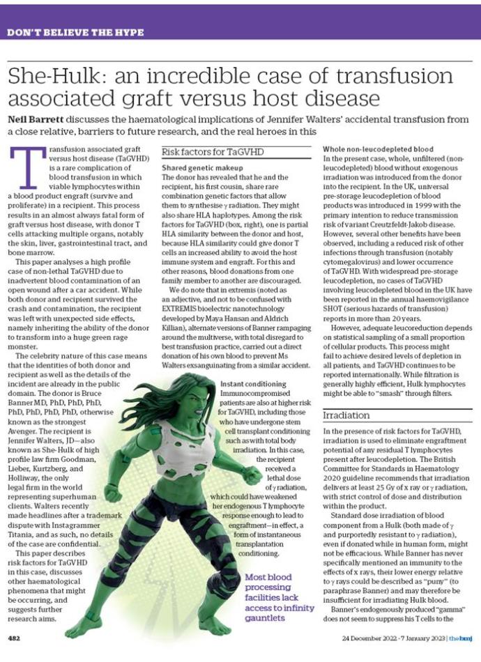 See Barrett, N. (2022) She-Hulk: an incredible case of transfusion associated graft versus host disease. British Medical Journal, 379,e074148 |