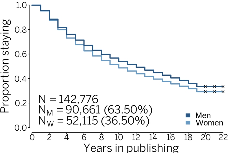 ![]() The proportion of 142,776 scientists still publishing research papers over 22 years.