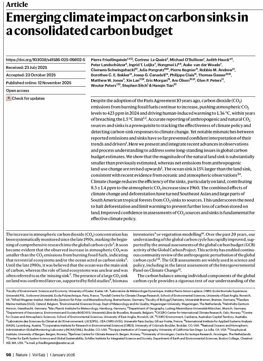 Friedlingstein, P., et al (2026) Emerging climate impact on carbon sinks in a consolidated carbon budget. Nature, vol. 649, p98-103. |