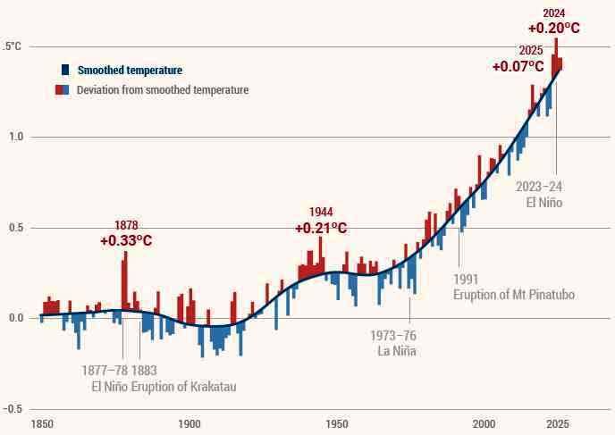 ![]() Fig. 13, Global Climate Highlights 2024, Copernicus Climate Change Service. Difference in global-average temperature (°C) from the 1850–1900 level, © Copernicus, 2025, used here in the context of a news review.